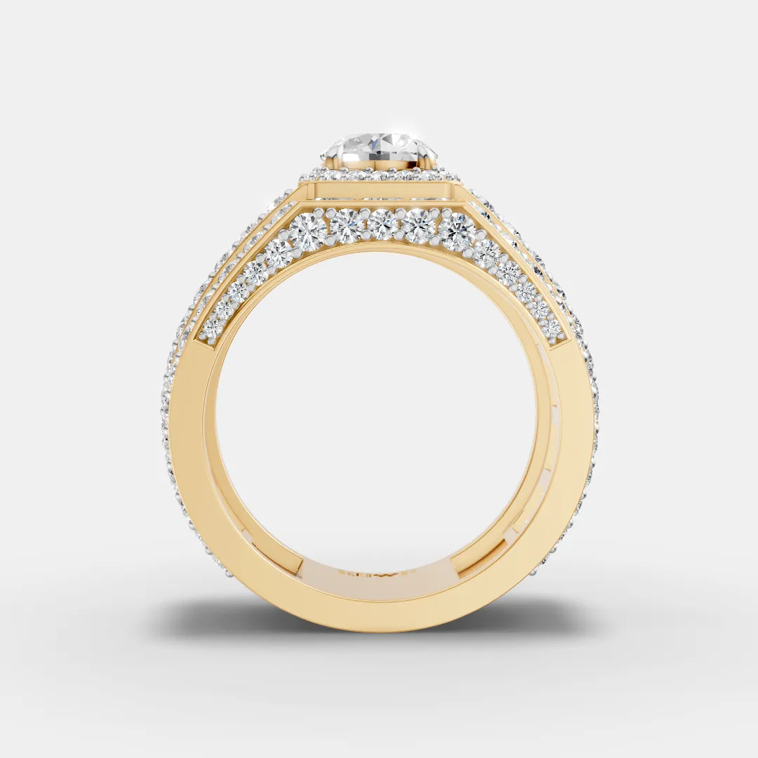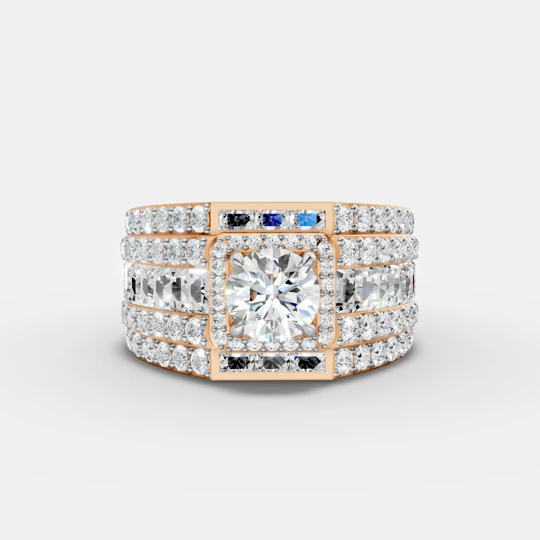 This bold and luxurious ring features a brilliant round center diamond framed by a sparkling halo that enhances its brilliance and visual impact. The wide band design is beautifully detailed with multiple rows of diamonds, creating a rich and radiant look from every angle. Additional accent diamonds along the sides add depth and extra sparkle, giving the ring a powerful and elegant presence. With its striking structure and exceptional shine, this ring is designed to make a strong statement and elevate any jewelry collection. ?
