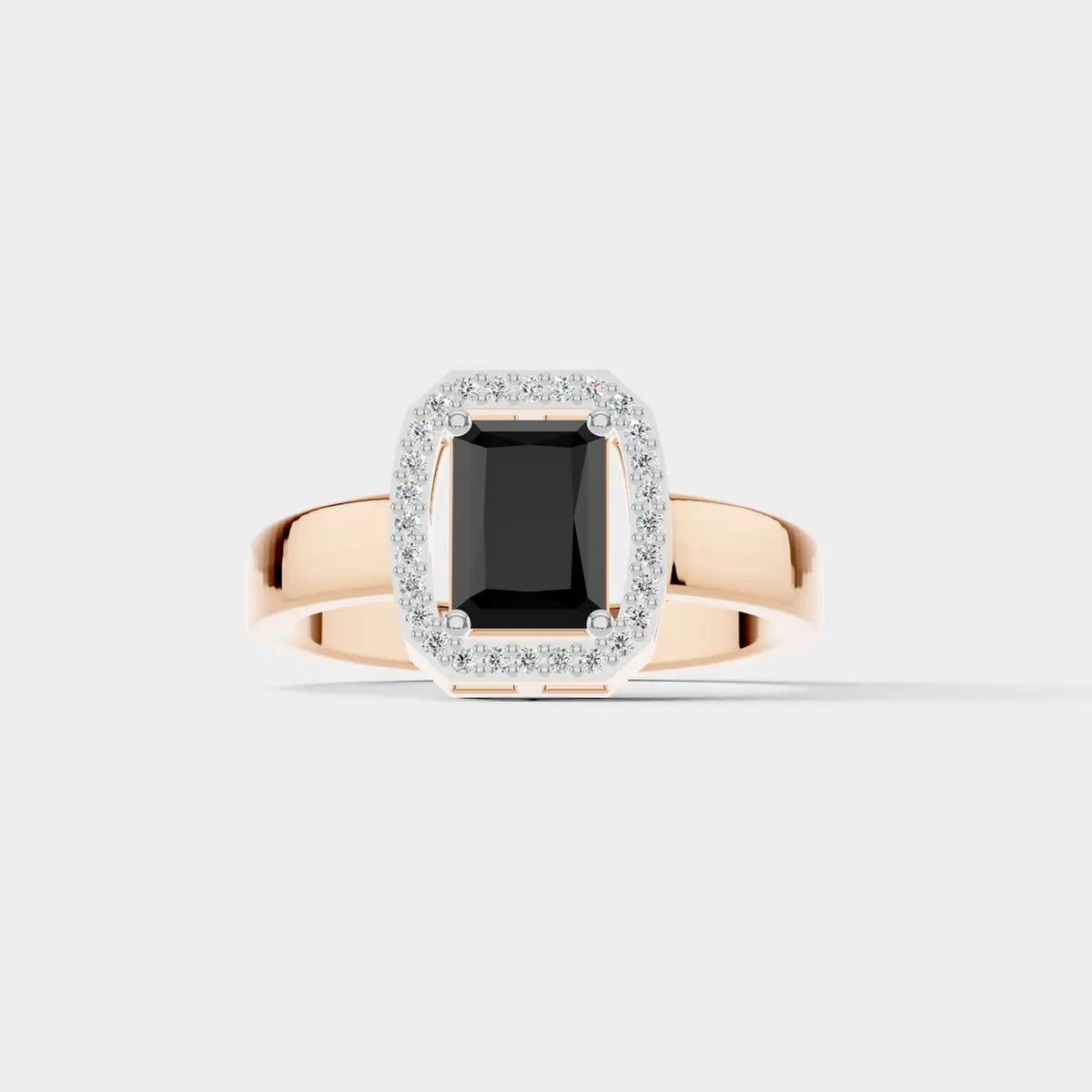 This striking ring showcases a bold rectangular black center stone that instantly draws attention with its deep and mysterious appearance. A shimmering halo of small diamonds surrounds the centerpiece, enhancing its brilliance and creating a beautiful contrast. The structured frame and clean edges give the ring a strong yet sophisticated presence. Its elegant band supports the elevated setting, allowing the design to stand out with refined balance. Perfect for those who appreciate distinctive jewelry, this ring offers a modern statement with timeless sparkle. ?
