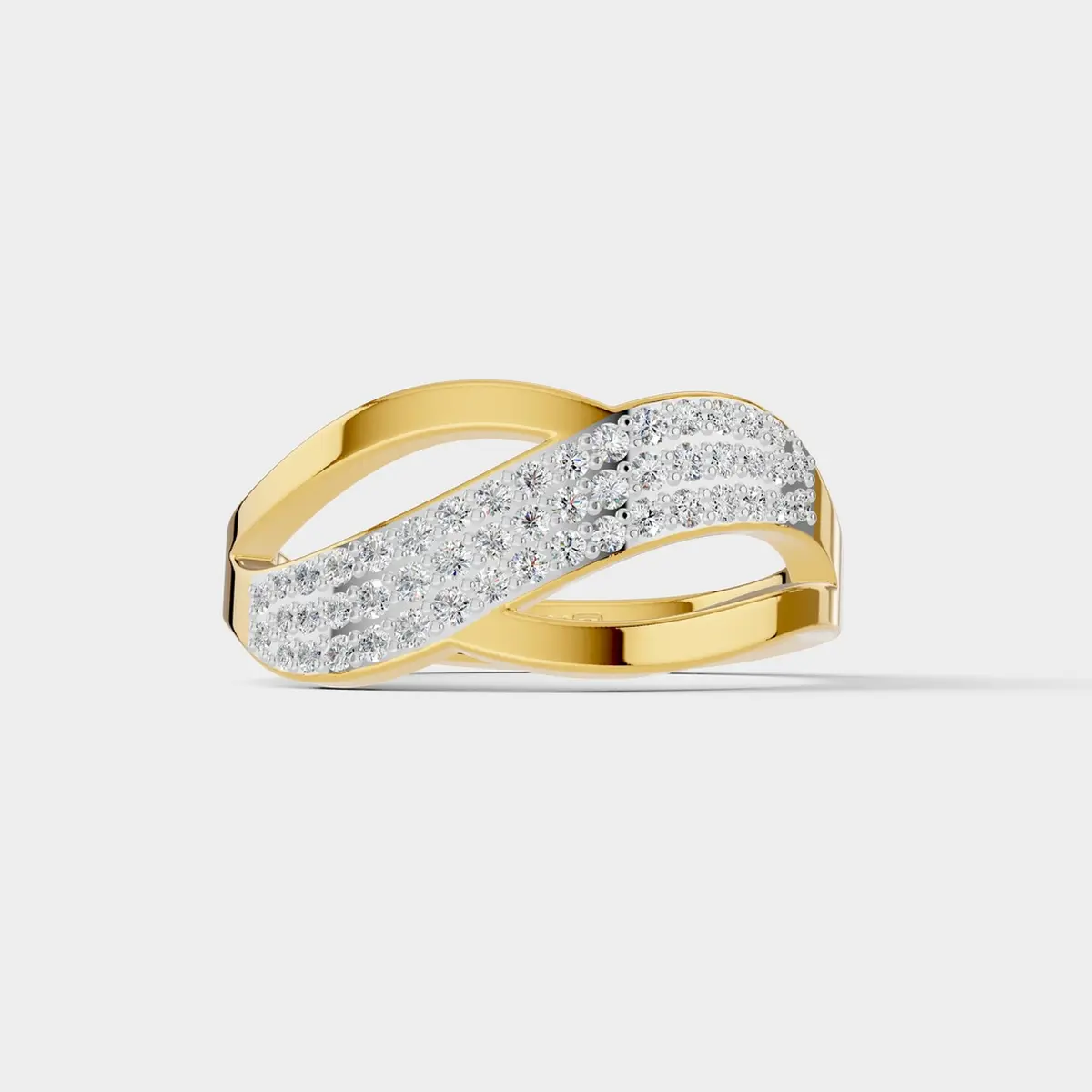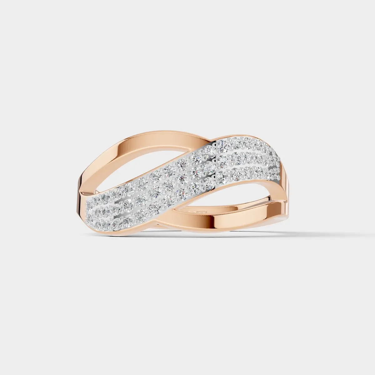 This elegant ring showcases a graceful crossover design that creates a modern and stylish look. The upper curve is adorned with a row of sparkling diamonds that add brilliance and shine from every angle. Its flowing structure gives the ring a layered appearance, making it both unique and eye-catching. The smooth band enhances the beauty of the diamond-studded curve while maintaining a balanced and refined design. Perfect for everyday wear or special occasions, this ring adds timeless sparkle to any jewelry collection. ?